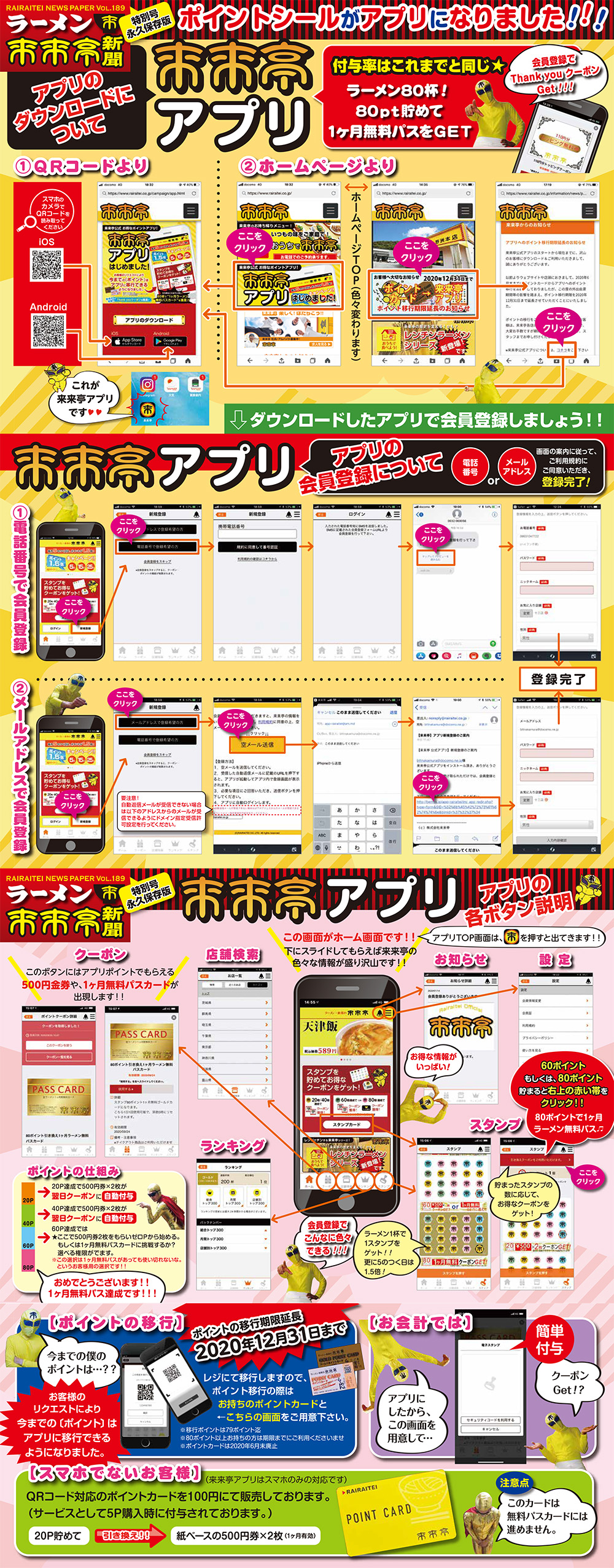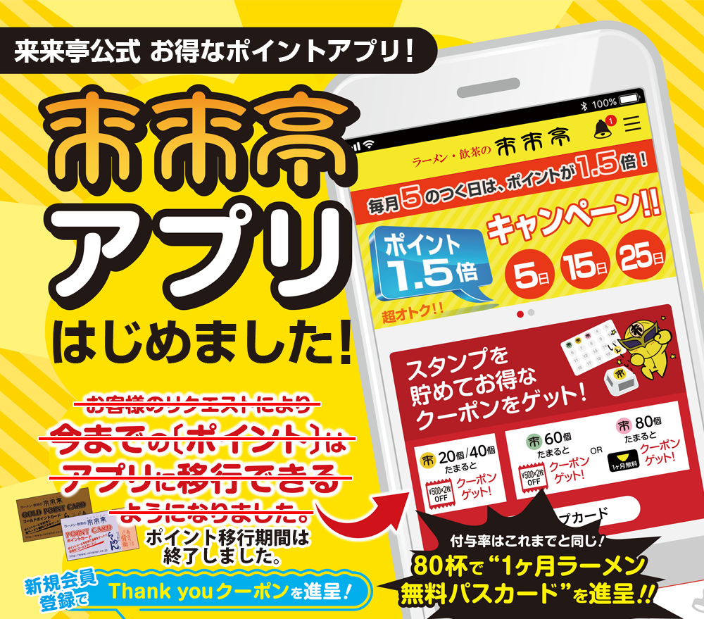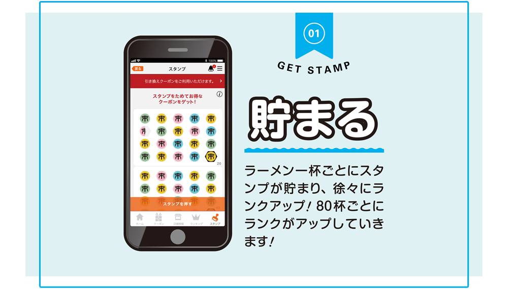 2.スタンプ機能があり、ラーメン1杯に付き1ポイント付与いたします。